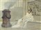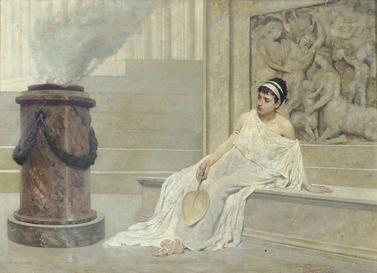 Eugenio Scomparini 1845-1913 "Vestale antica" (1877) cm. 32x44 - olio su tela Firmato b. a d. Pubbl.: catalogo E. Scomparini a cura Fondazione CRTrieste2007, pag. 86-87. Prov.: Barone Rosario Curio; Carlo Costantini; Il Giardino Trieste 1988; collezione Basilio Trieste..