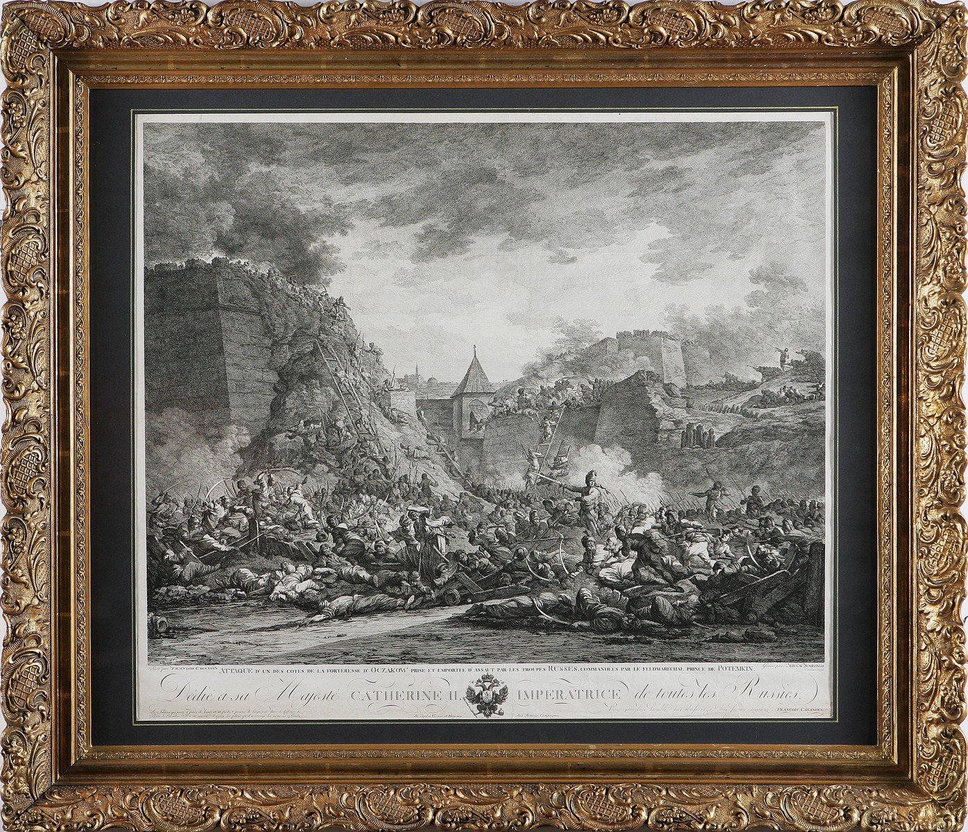 VON BARTSCH ADAM (1757 - 1821) L'assedio alla fortezza d'Oczakow. 1792. Acquaforte e bulino. Cm 82x65,6. Disegnatore, incisore e studioso di incisione austriaco, si è formato a Vienna alla scuola d’incisione di J. SCHMUTZER. Tra tutte le maniere d’incidere da lui praticate, sembra aver egli dato la preferenza ai generi più speditivi, come all’imitazione degli schizzi a matita ed all’acquerello, ed al tratteggiato pittoresco dell’acquaforte, quasi nello stile di Rembrant, maniera di cui egli iede pregevoli saggi. Si dice che egli passasse spesso a Parigi per procurarsi disegni, che poi intagliava a Vienna. Disegnatore, incisore e studioso di incisione austriaco, si è formato a Vienna alla scuola d’incisione di J. SCHMUTZER. Tra tutte le maniere d’incidere da lui praticate, sembra aver egli dato la preferenza ai generi più speditivi, come all’imitazione degli schizzi a matita ed all’acquerello, ed al tratteggiato pittoresco dell’acquaforte, quasi nello stile di Rembrant, maniera di cui egli diede pregevoli saggi. Si dice che egli passasse spesso a Parigi per procurarsi disegni, che poi intagliava a Vienna.Vienna 1792 - Incisione all'acquaforte e bulino, dim. foglio con i margini L. 82 X 65,6 cm. (L. 72,8 X 58 cm. la sola parte incisa senza le lettere) incorniciata in bella cornice foglia oro di fine ‘800 (dim. ingombro: L. 103 X 87 cm.).Titolo: In basso a sinistra: Peint par FRANCOIS CASANOVA... al centro: ATTAQUE D'UN DES COTES DE LA FORTERESSE D'OCZAKOW PRISE ET EMPORTEE D'ASSAUT PAR LES TROUPES RUSSES, COMMANDEES PAR LE FEDMARECHAL PRINCE DE POTEMKIN.. a dx.: Gravé par ADAM BARTSCH à Vienne 1792... più sotto al centro tra lo stemma Asburgico: Dedié a sa Majesté CATHERINE II... ...IMPERATRICE de toutes les Russies... più sotto ancora la descrizione e l'indirizzo dell'editore: Se vend à Vienne et Majence chez Artaria Compagnie...Bibliogr.: F. Von Bartsch, Catalogue des estampes de J. A. de Bartsch, Vienna 1818 - LE BLANC, I, 175-184 - HEINEKEN, II, 204 - JOUBERT, I, 221 - HUBER et ROST, II, 327 - FRIEDRICH von BARTSCH - HELLER, 35, ecc.. Titolo in basso a sinistra.