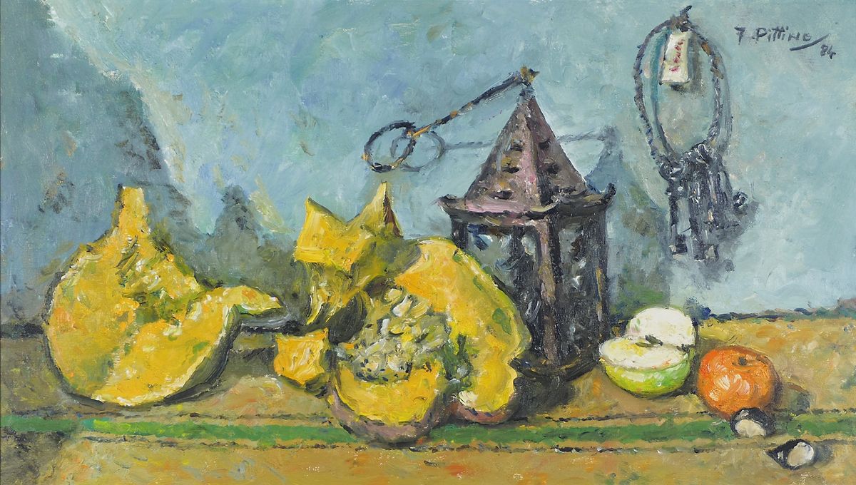 Fred Pittino Dogna (UD) 1906-1991 "Fette di zucca" cm. 40x70 - olio su tela Firmato alto a d. e datato '84. Al retro etichetta dell'Artista con dati dell'opera.