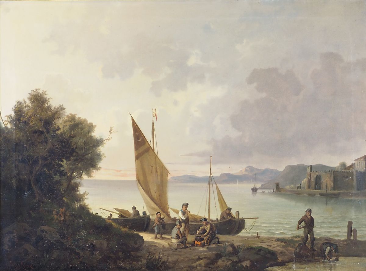 Antonio Rosè Trieste 1848-1918 "Giovani pescatori in riposo" cm. 52x70 - olio su tela Firmato b. a s.