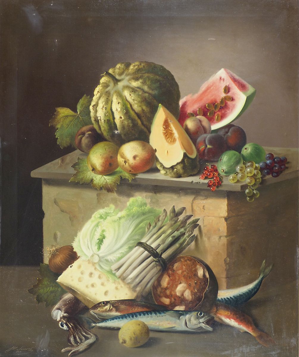 Francesco Malacrea Trieste 1813-1886 "Natura morta con frutta e pesci" cm. 89x74 - olio su tela Firmato b. a s.