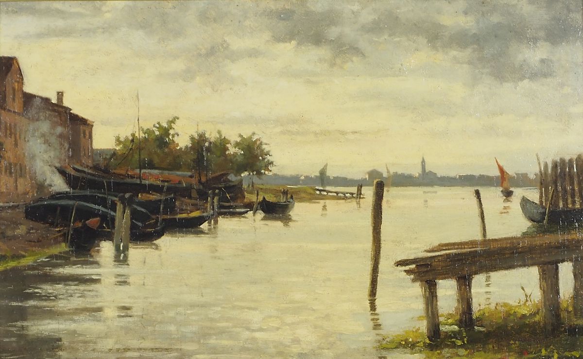 Pietro Fragiacomo 1856-1922 "Conato di S. Pietro di Castello, Venezia" cm. 22x36 - olio su tavola Firmato b. a d. AL retro titolo su vecchio cartellino.