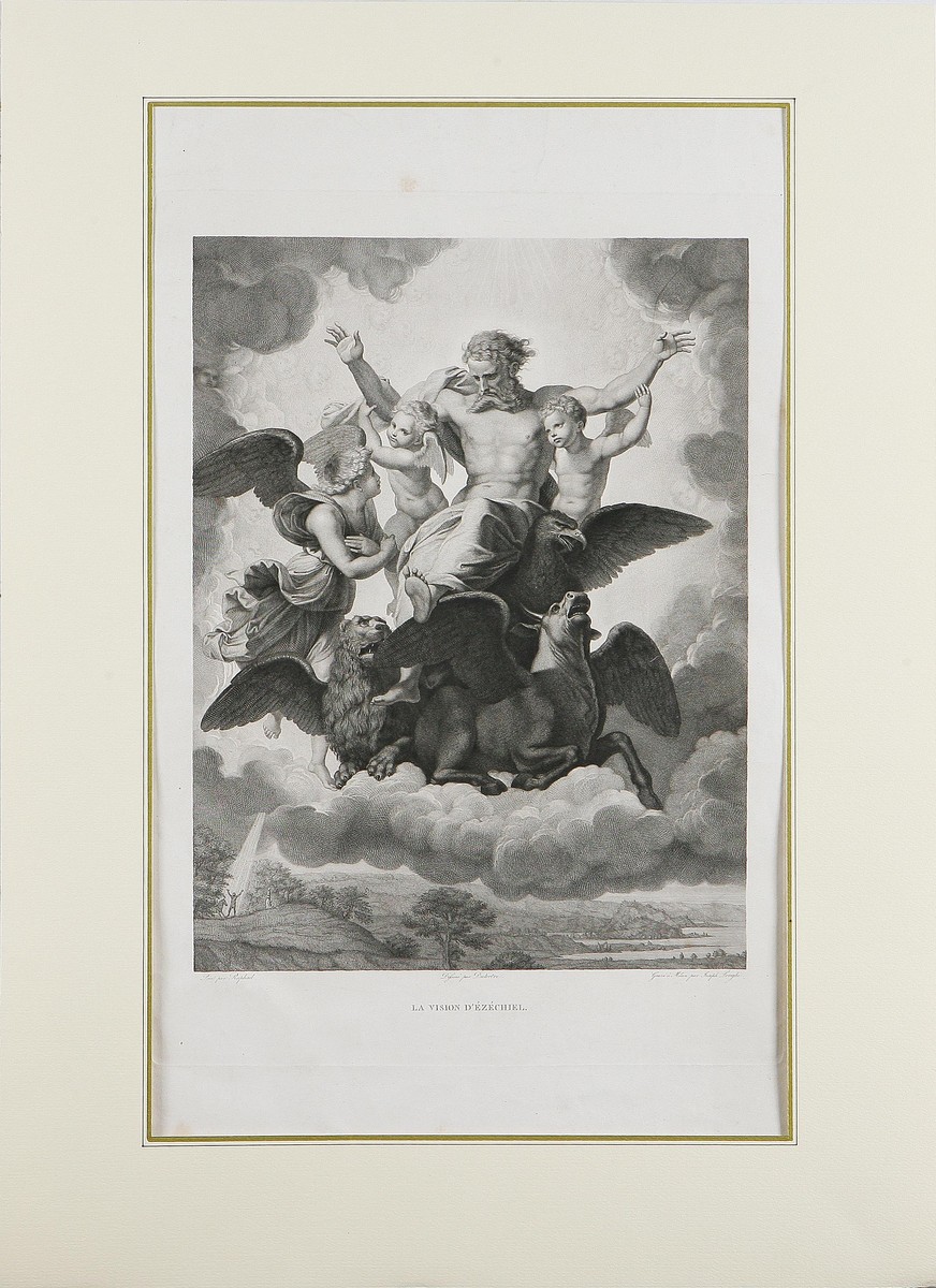 LONGHI GIUSEPPE (1766 - 1831) La visione d'Ezechiele. 1808. Bulino. Cm 45x60,5. Incisione a bulino tratta da un dipinto di Raffaello e da un disegno di Dutertre - Milano 1808 - Dim. del foglio con ampi margini L. 45 x 60,5 cm. (dim. della sola parte incisa, esclusa delle lettere L. 29,5 x 39,2 cm.) - 3° stato su 3.Bibliogr.: LE BLANC, II, 567-568 - H. BERALDI, IX, 189-190 - VALLARDI, 120-122 - MILESI, 213 - La Calcografia propriamente detta - GIUSEPPE LONGHI, pag. 413 (2)