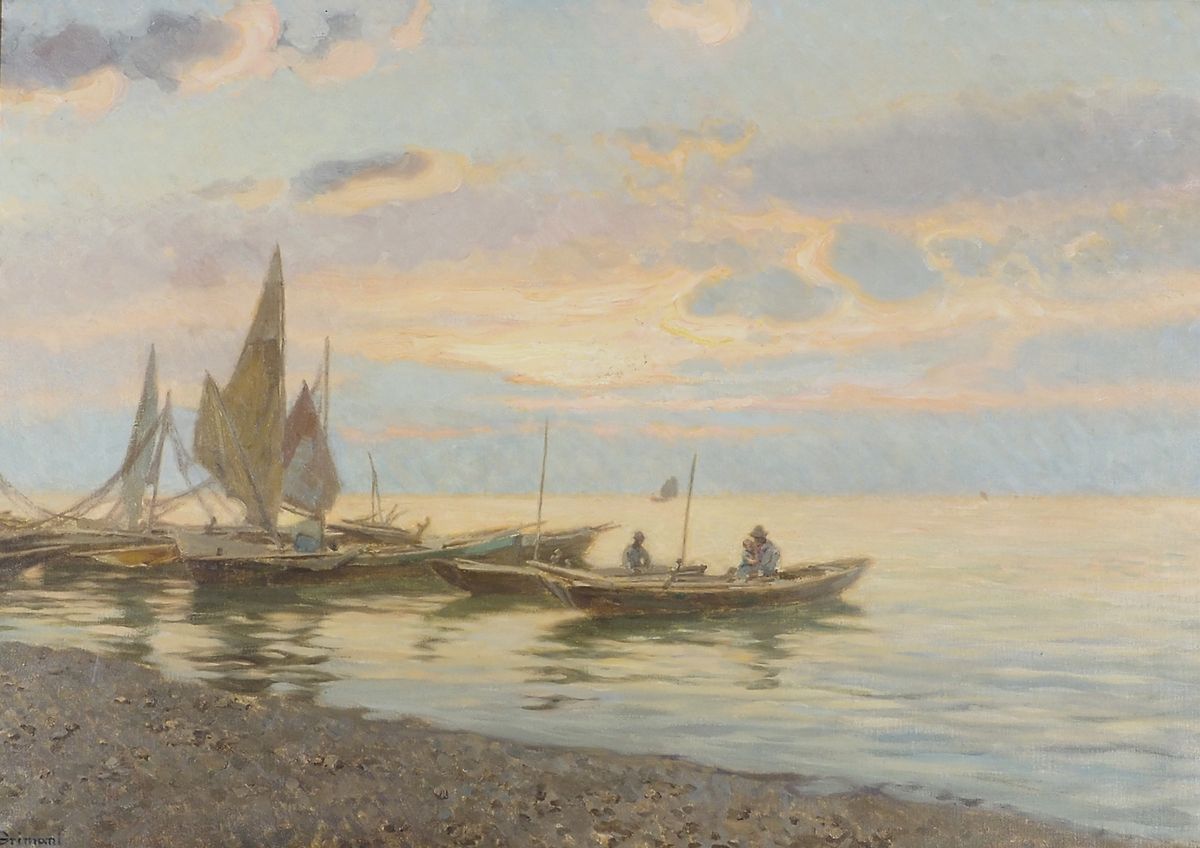Guido Grimani Trieste 1871-1933 "Marina al tramonto" cm. 65x85 - olio su tela Firmato b. a s.