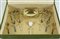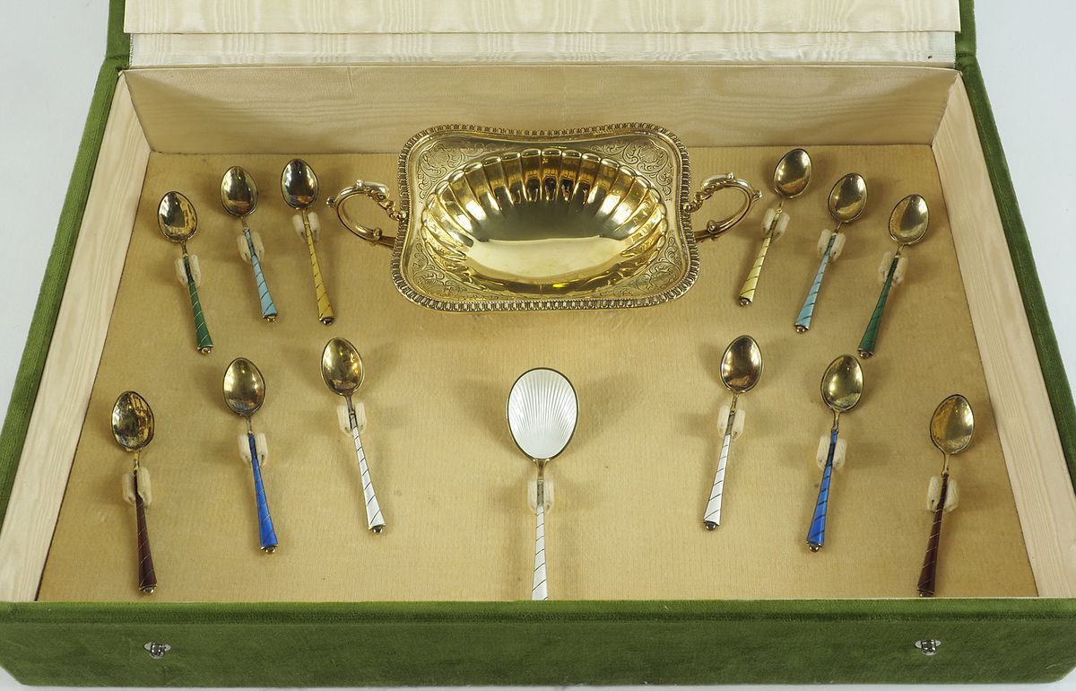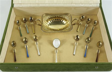 Set di 12 cucchiaini in argento dorato e smalti policromi con zuccheriera in argento dorato e altro cucchiaio smaltato bianco. Entro teca originale.