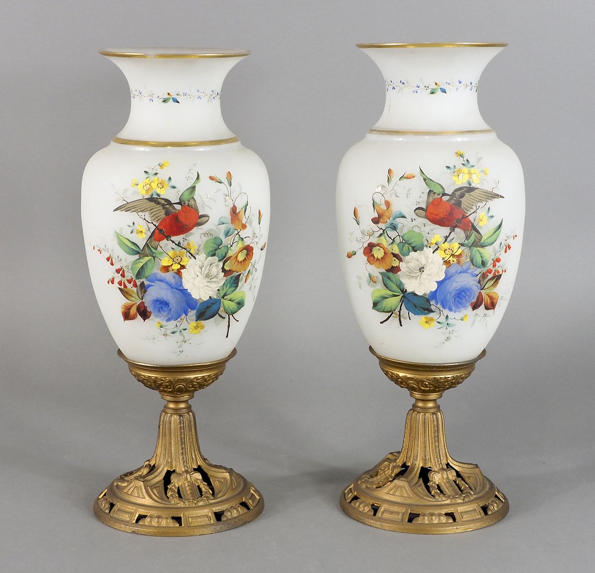 Coppia di vasi in vetro opalino dipinto a motivi floreali, montatura in metallo dorato. H. cm. 43 (uno sbeccato).