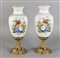 Coppia di vasi in vetro opalino dipinto a motivi floreali, montatura in...