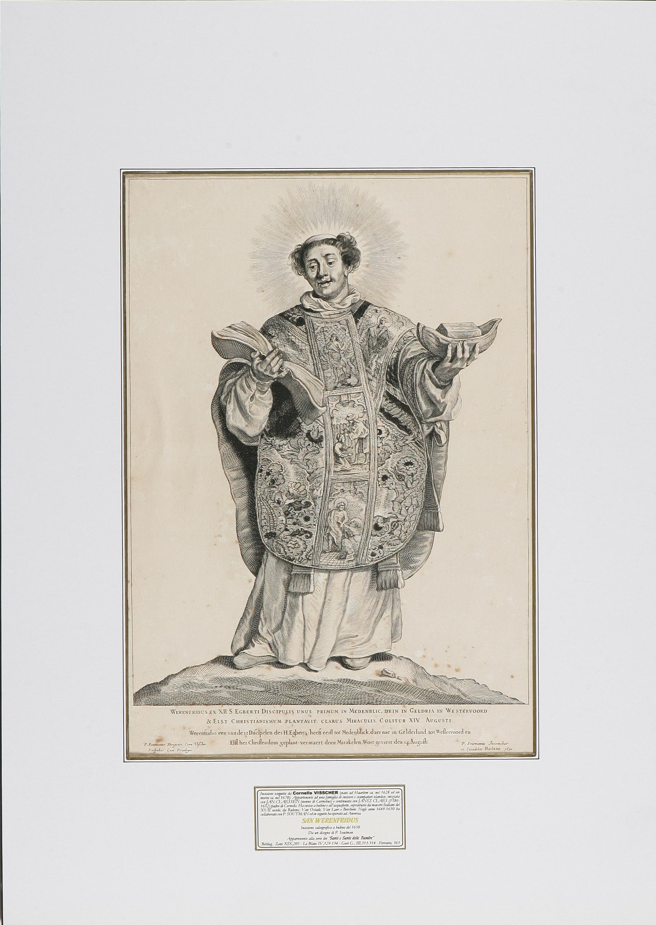 WISSCHER CORNELIS (1628 - 1670) San Werenfridus. 1650. Acquaforte. Cm 32,5x46,5. Incisione all’acquaforte da un disegno di P. Soutman, tratta dalla serie “Santi e Sante delle Fiandre” - Harlem 1650 - Dim. dell’intero foglio con piccolo margine L. 32,5 x H. 46,5 cm.Bibliogr.; ZANI, xix, 205 - LE BLANC, iv, 129-134 - GORI G., III, 313-314 - FERRARIO, 363 - BRYAN’S, V, 309-310.