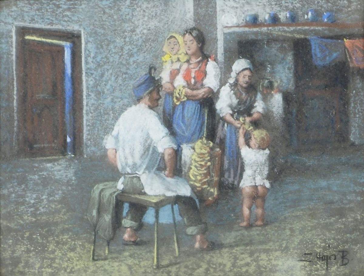 Pittore ungherese del '900 "Riunione di famiglia" cm. 23x30 - pastelli colorati Firmato b. a d.