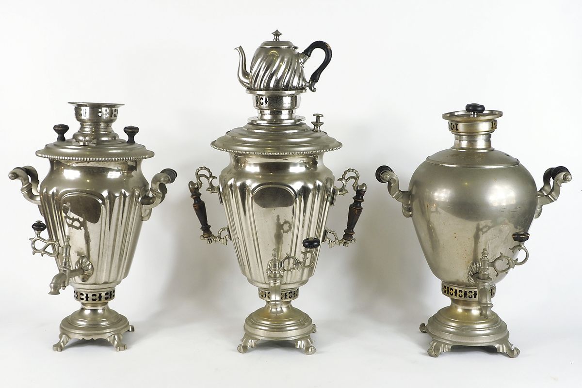 Lotto di 3 grandi samovar russi in metallo. H. max cm. 60.