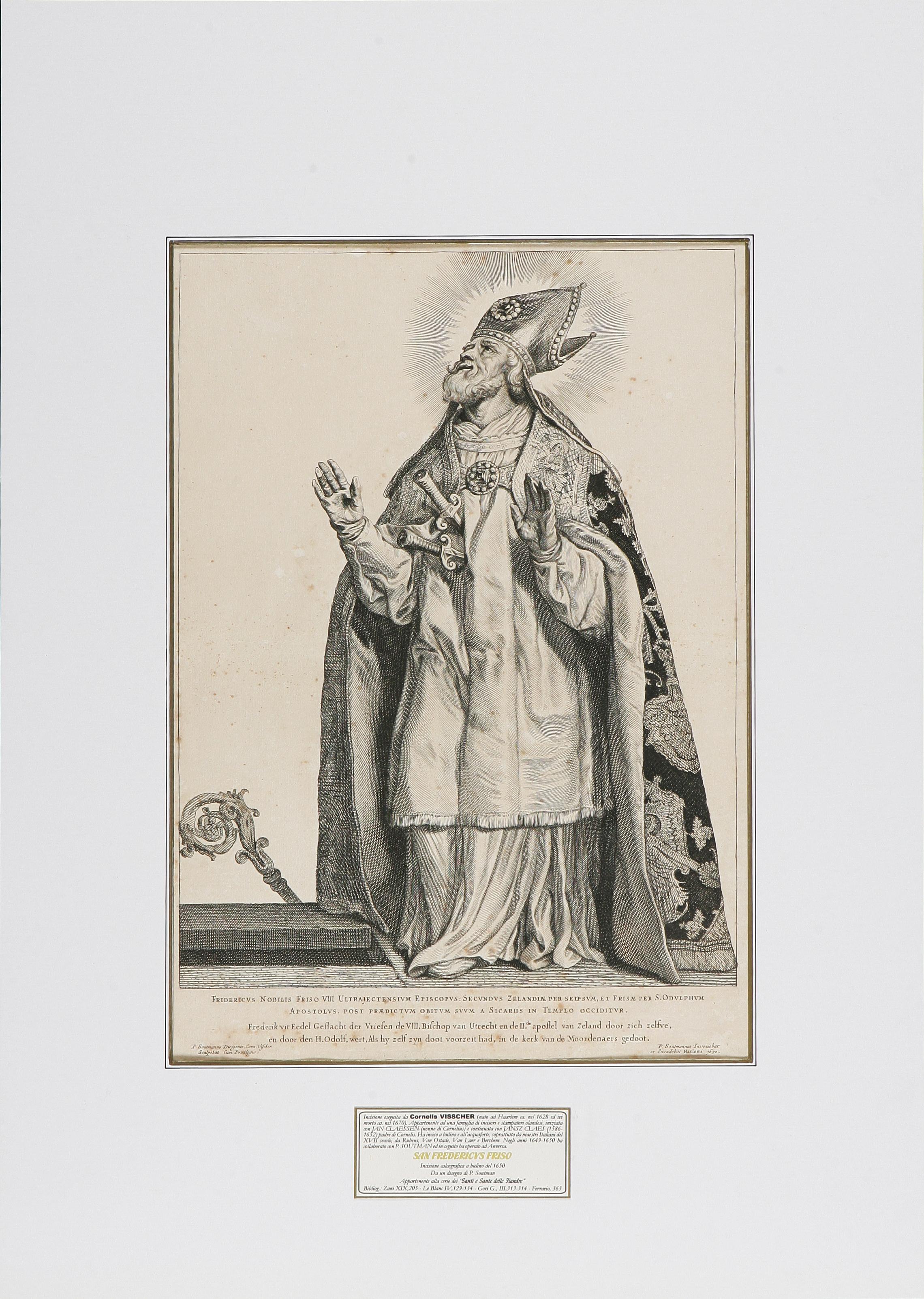 WISSCHER CORNELIS (1628 - 1670) San Fredericus Friso. 1650. Acquaforte. Cm 32,5x46,5. Incisione all’acquaforte da un disegno di P. Soutman, tratta dalla serie “Santi e Sante delle Fiandre” - Harlem 1650 - Dim. dell’intero foglio con piccolo margine L. 32,5 x H. 46,5 cm.Bibliogr.; ZANI, xix, 205 - LE BLANC, iv, 129-134 - GORI G., III, 313-314 - FERRARIO, 363 - BRYAN’S, V, 309-310.