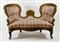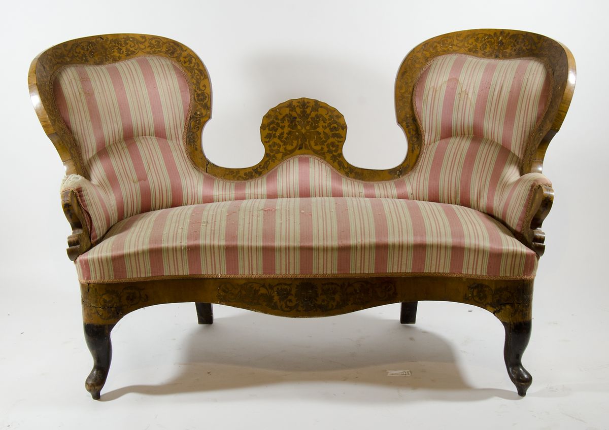 Divano a tre posti in legno intarsiato in legni scuri a motivi floreali. XIX...
