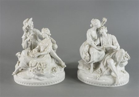 Lotto di 2 gruppi in porcellana bianca con figure. Uno marcato N con corona....