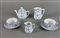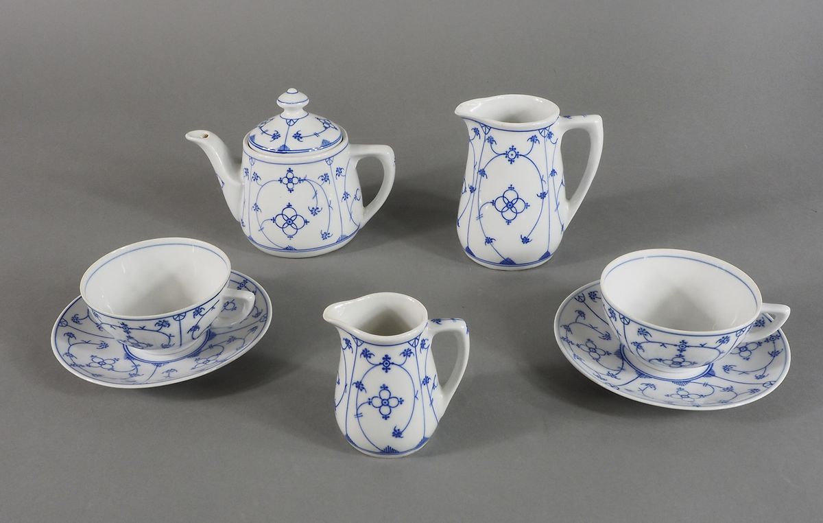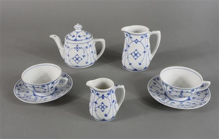 Meissen; servizio tete-a-tete in porcellana bianca e blu composto da 2 tazze con piattino, caffettiera e 2 lattiere.