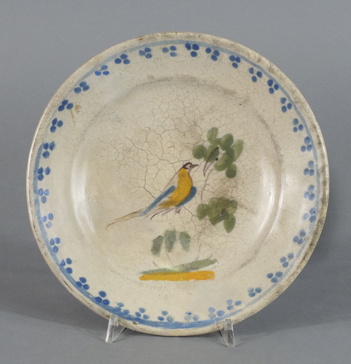 Piatto in ceramica decorata a smalti policromi con al centro figura di uccello. Diam. cm. 22.