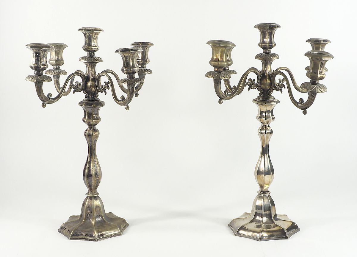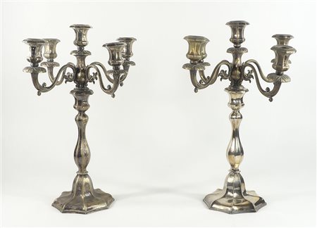 Paio di grandi candelabri in metallo argentato a 5 fiamme. H. cm. 48.
