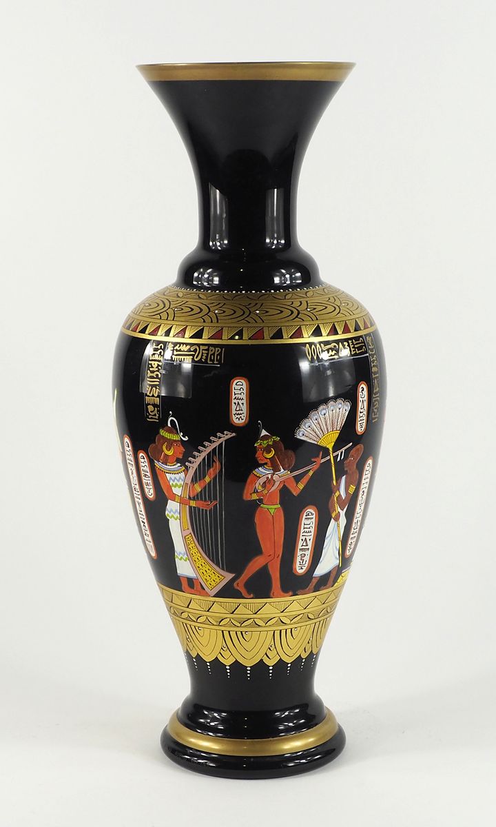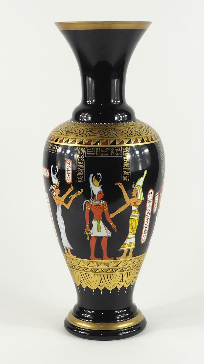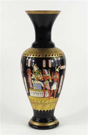 Vaso in vetro scuro dipinto con figure egizie. Reca la scritta "decorato a mano Murano oro 24kt". H. cm. 51.