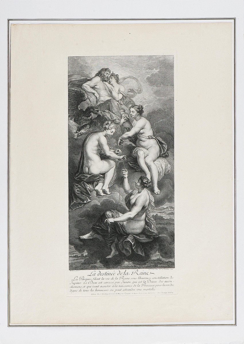 DE CHATILLON LOUIS (1639 - 1734) Il destino della regina. 1708. Acquaforte e bulino. Cm 45,8x61. Incisione all’acquaforte e bulino tratta da un dipinto di Rubens su disegno di I.B. Nattier (appartenente alla raccolta dei dipinti di Rubens de “La Galerie du Luxemburg”) - Parigi 1708 - Dim. della stampa con ampi margini: L. 45,8 x 61 cm. (dim. della sola parte incisa senza le lettere L. 21,8 x 43,6 cm.).Bibliogr.: ZANI, VI, 162 - LE BLANC, I, 638-639 - VALLARDI, 147 - GORI G., I, 216 - E. BENEZIT, II, 693 (Ed. 1976).