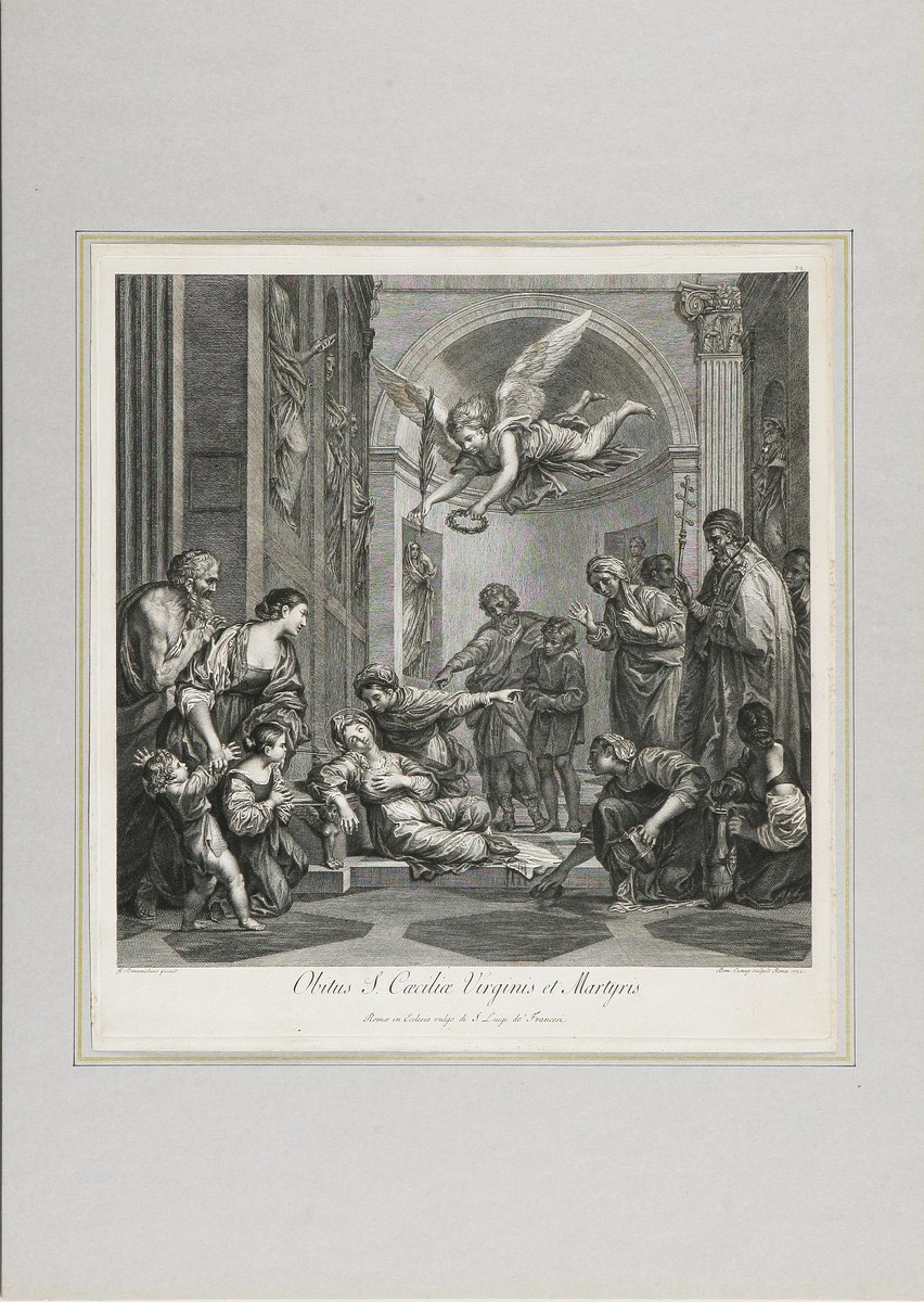 CUNEGO DOMENICO (1727 - 1803) La morte di Santa Cecilia martire. 1772. Acquaforte. Cm 40x43. Incisione calcografica all’acquaforte tratta da un dipinto del Domenichino (opera appartenente alla raccolta realizzata da Gavino Hamilton: Schola Italica Picturae..- tav. 32) - Roma 1772 - Dim. della stampa compreso i piccoli margini L. 40 x 43 cm. (dim. della sola parte incisa senza lettere L. 37,5 x 37 cm)Bibliogr.: VALLARDI, 134, MILESI, 120 - DE ANGELIS, IX, 74-80 - BRYAN’S, I, 361 - HUBER E ROST, IV, 168-173.