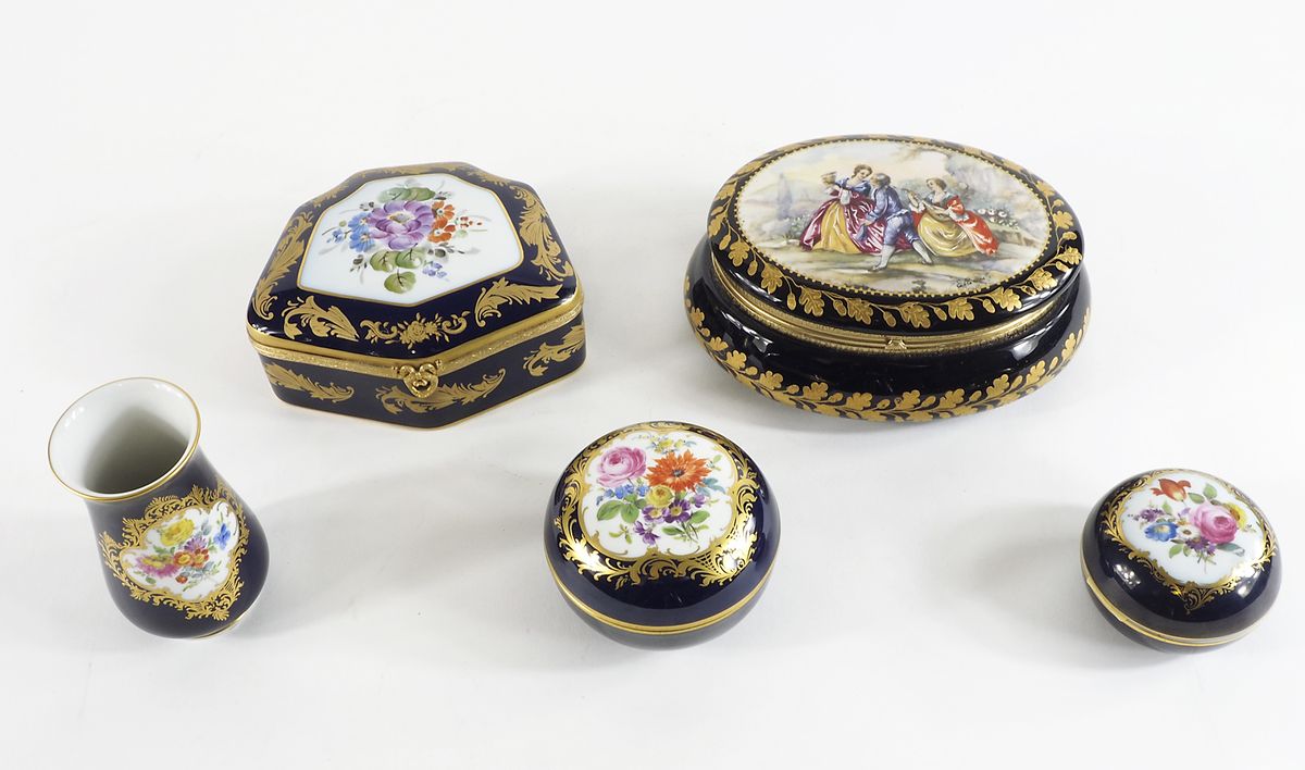 Lotto di 5 contenitori in porcellana blu con decori policromi.tra cui scatoletta Meissen.