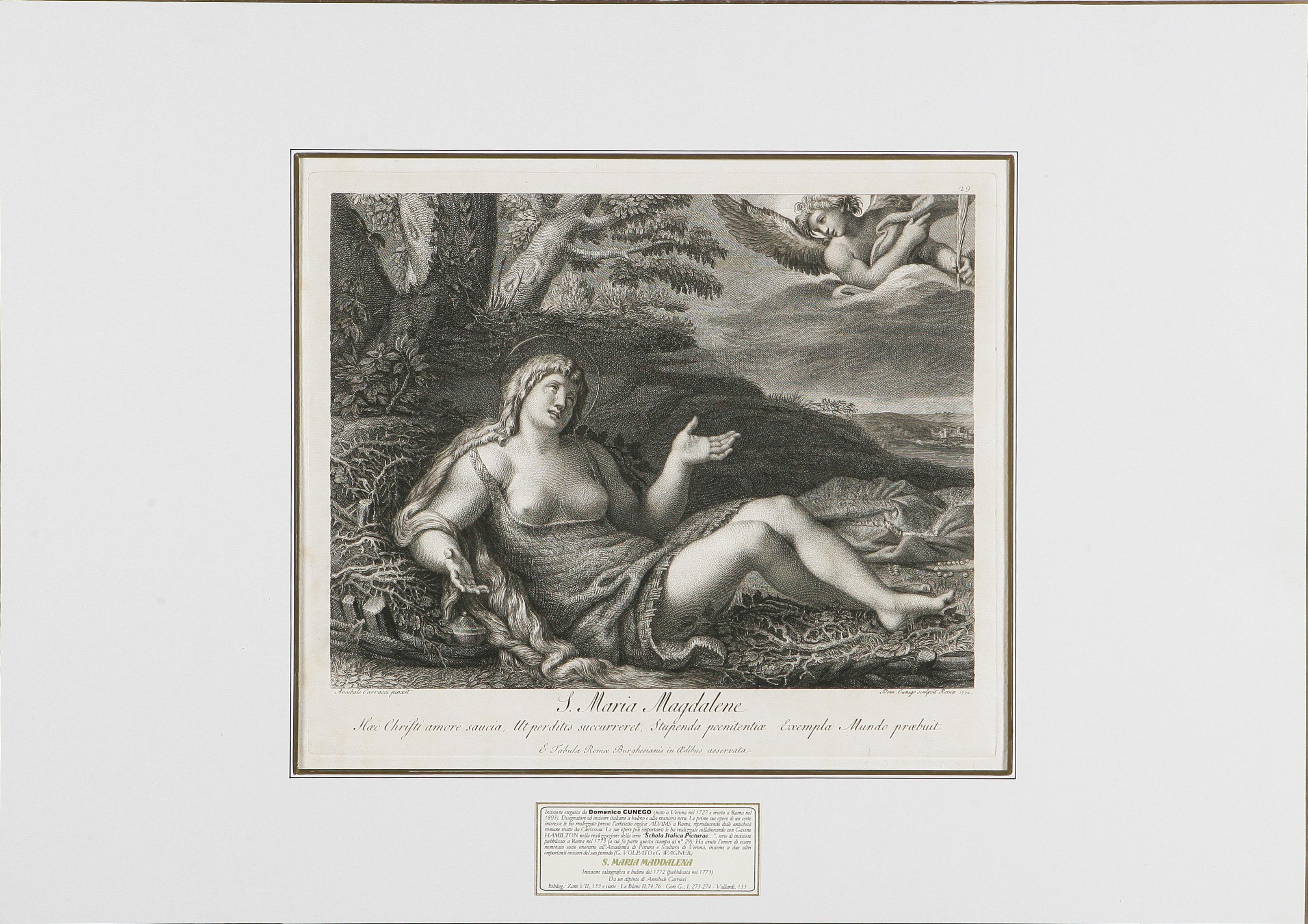 CUNEGO DOMENICO (1727 - 1803) S Maria Maddalena. 1772. Acquaforte. Cm 67,5x47. Incisione calcografica all’acquaforte tratta da un dipinto di Annibale Carracci (opera appartenente alla raccolta realizzata da Gavino Hamilton: Schola Italica Picturae..- tav. 29) - Roma 1772 - Dim. della stampa compreso gli ampi margini L. 67,5 x 47 cm. (dim. della sola parte incisa senza le lettere L. 34,5 x 26,8 cm.).Bibliogr.: VALLARDI, 134, MILESI, 120 - DE ANGELIS, IX, 74-80 - BRYAN’S, I, 361 - HUBER E ROST, IV, 168-173.