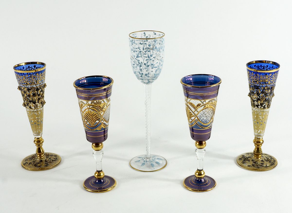 Lotto composto da 5 calici in vetro decorato. H. max cm. 25.