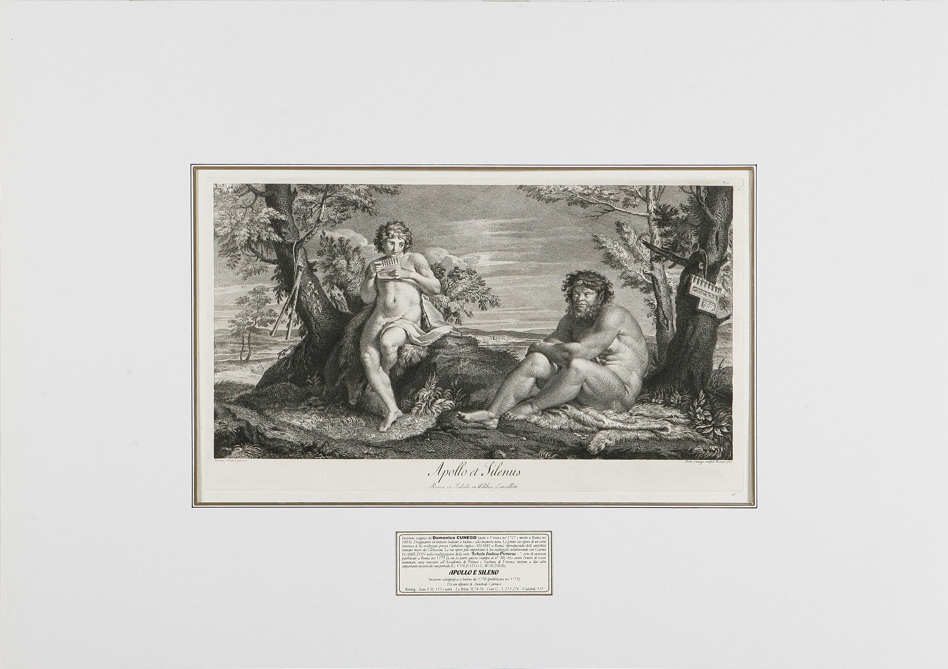 CUNEGO DOMENICO (1727 - 1803) Apollo e Sileno. 1772. Acquaforte. Cm 67,5x47. Incisione calcografica all’acquaforte tratta da un dipinto di Annibale Carracci (opera appartenente alla raccolta realizzata da Gavino Hamilton: Schola Italica Picturae..- tav. 30) - Roma 1772 - Dim. della stampa compreso gli ampi margini L. 67,5 x 47 cm. (dim. della sola parte incisa senza le lettere L. 38,2 x 20,5 cm.).Bibliogr.: VALLARDI, 134, MILESI, 120 - DE ANGELIS, IX, 74-80 - BRYAN’S, I, 361 - HUBER E ROST, IV, 168-173.