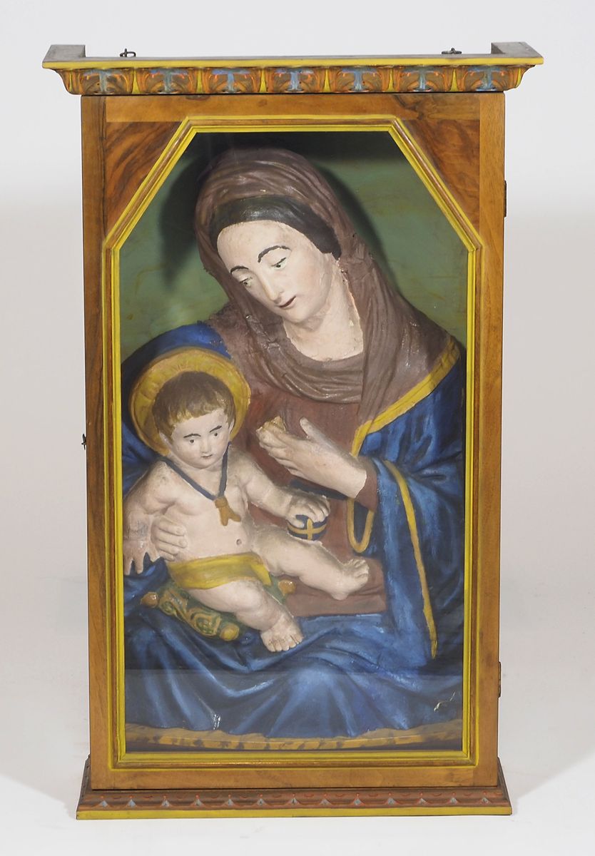 Scultura in cartapesta dipinta raffigurante Madonna con bambino, entro teca...