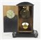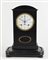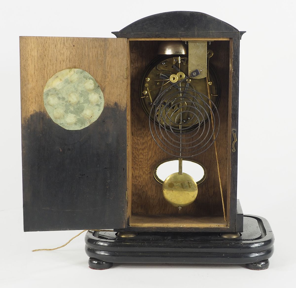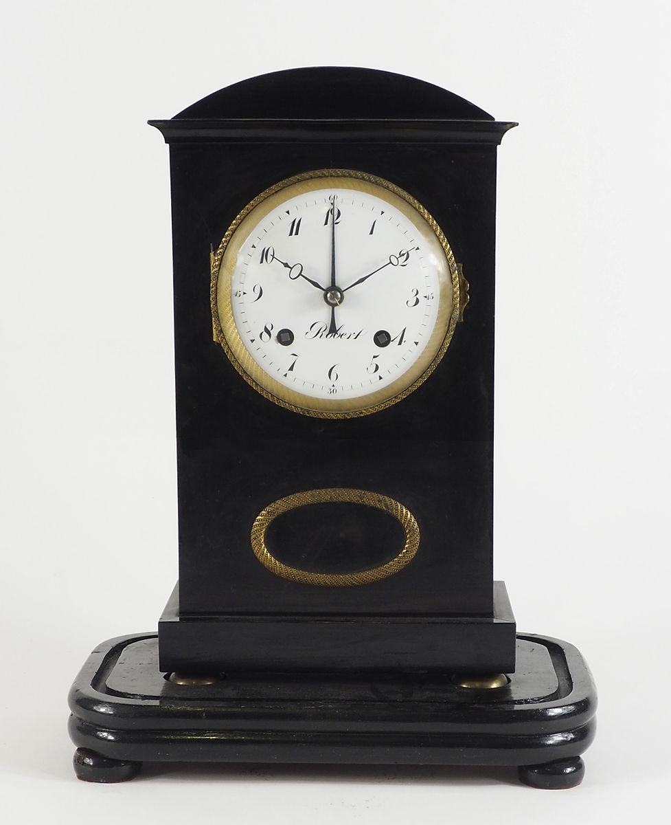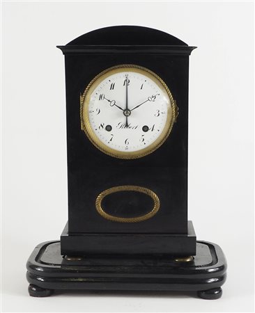 Orologio da tavolo in legno nero con quadrante in ceramica bianca. H. cm. 39.