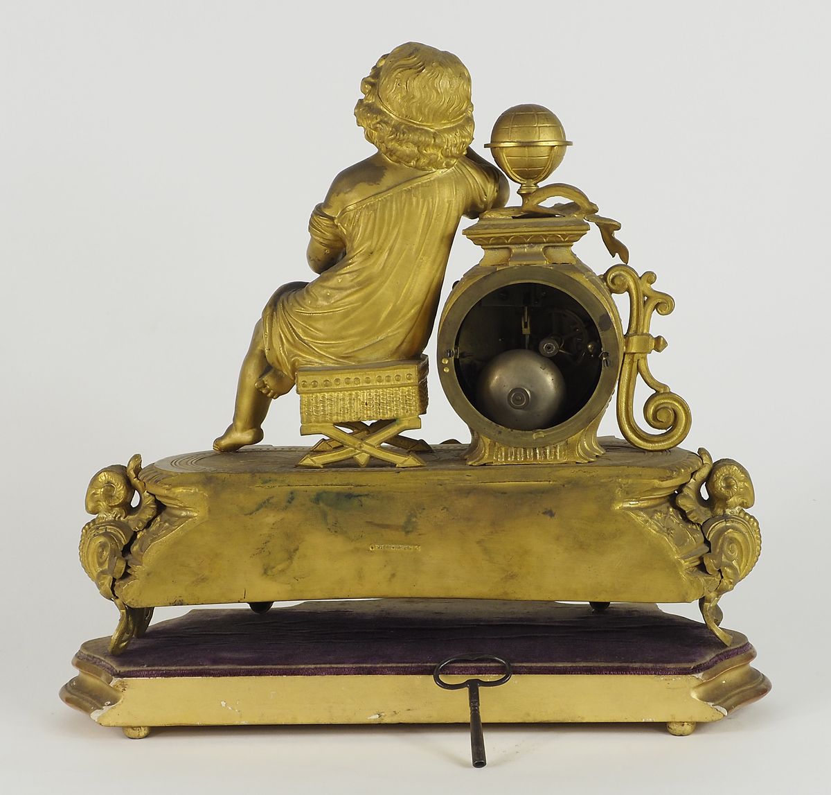 Orologio da tavolo in metallo dorato con figura di bambina, quadrante bianco...