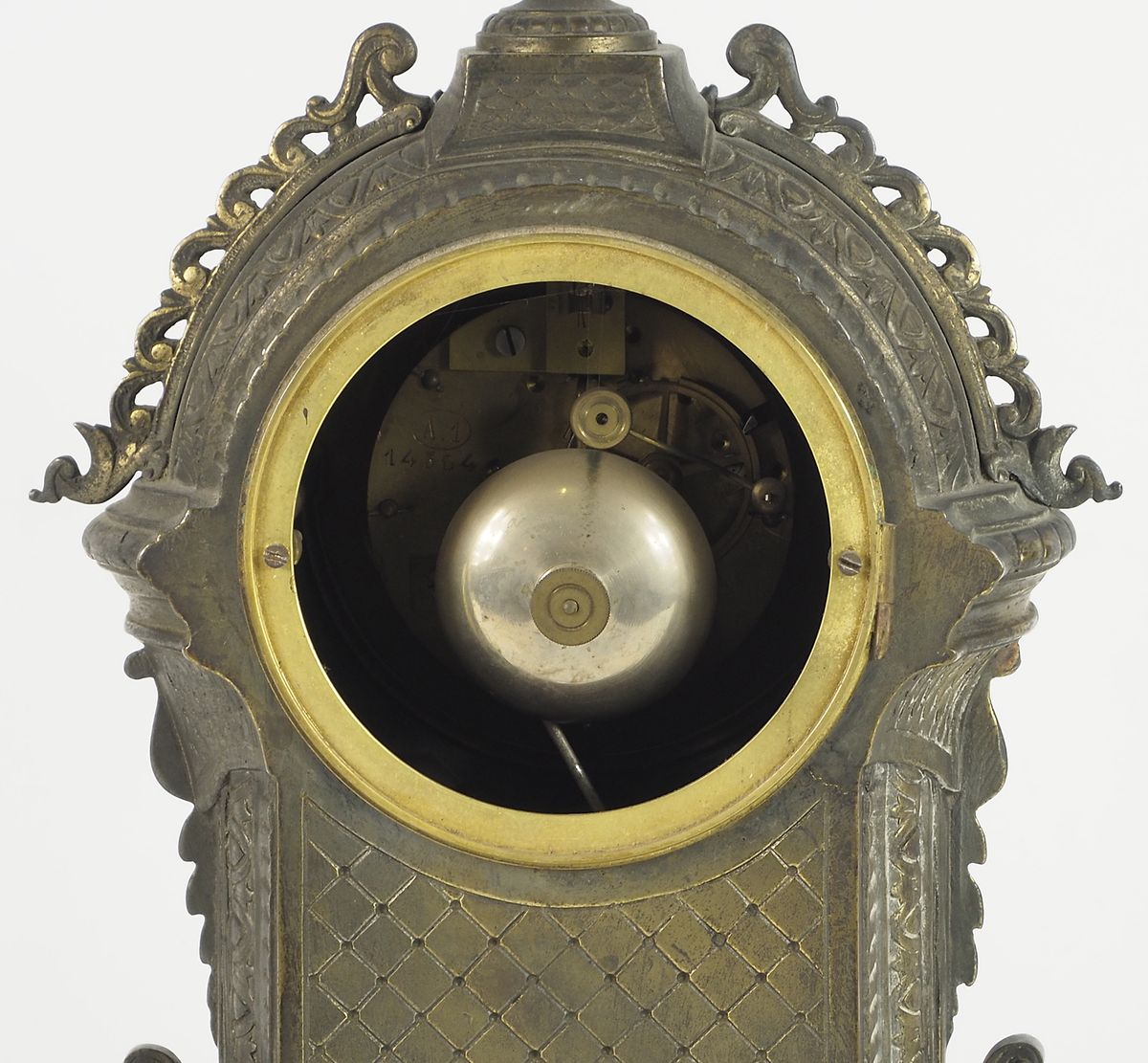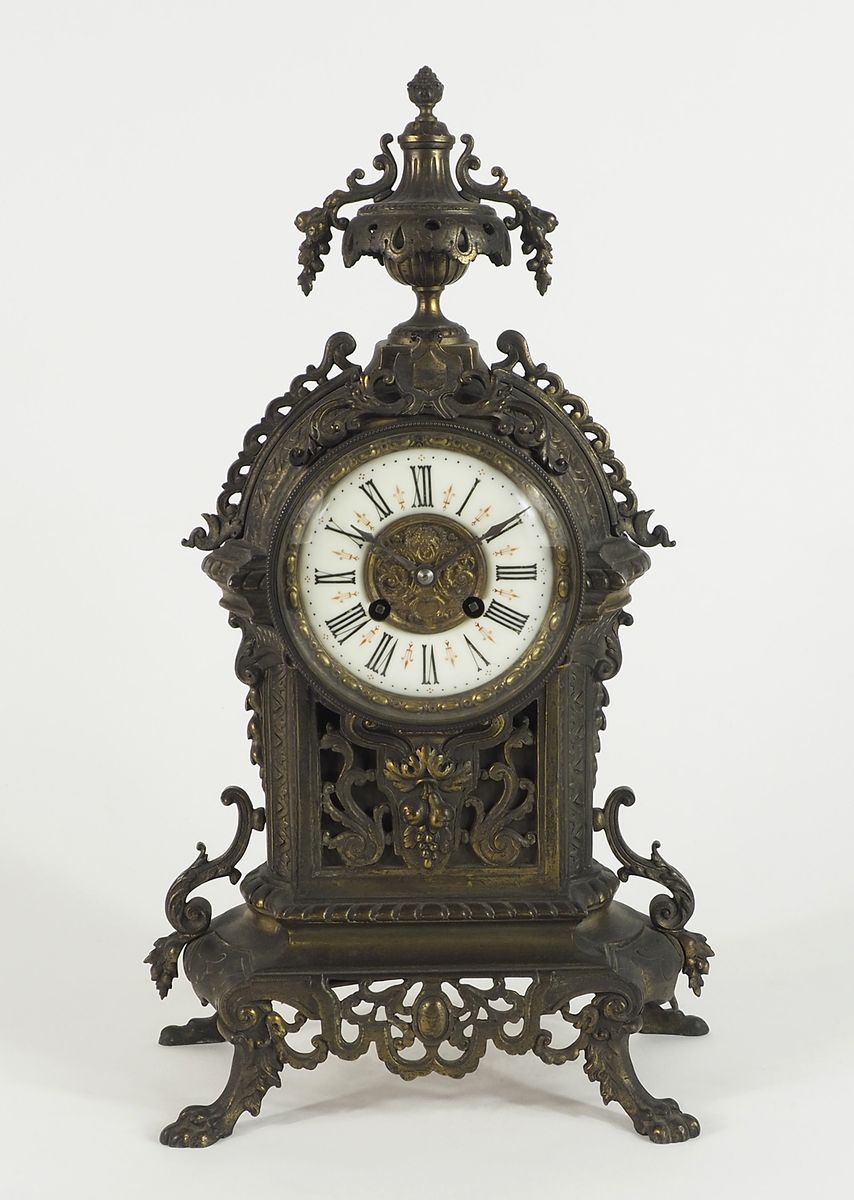 Orologio da tavolo in metallo con quadrante a numeri romani. H. cm. 45.