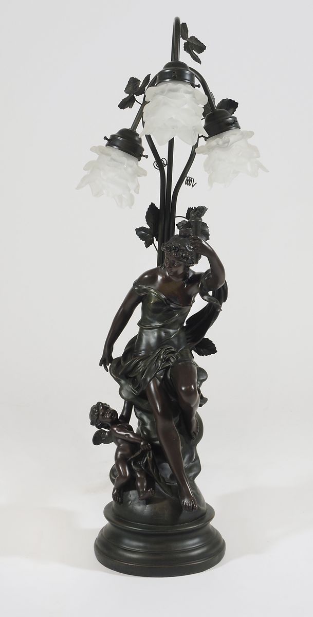 Lampada da terra in antimonio raffigurante figura femminile, base in marmo....