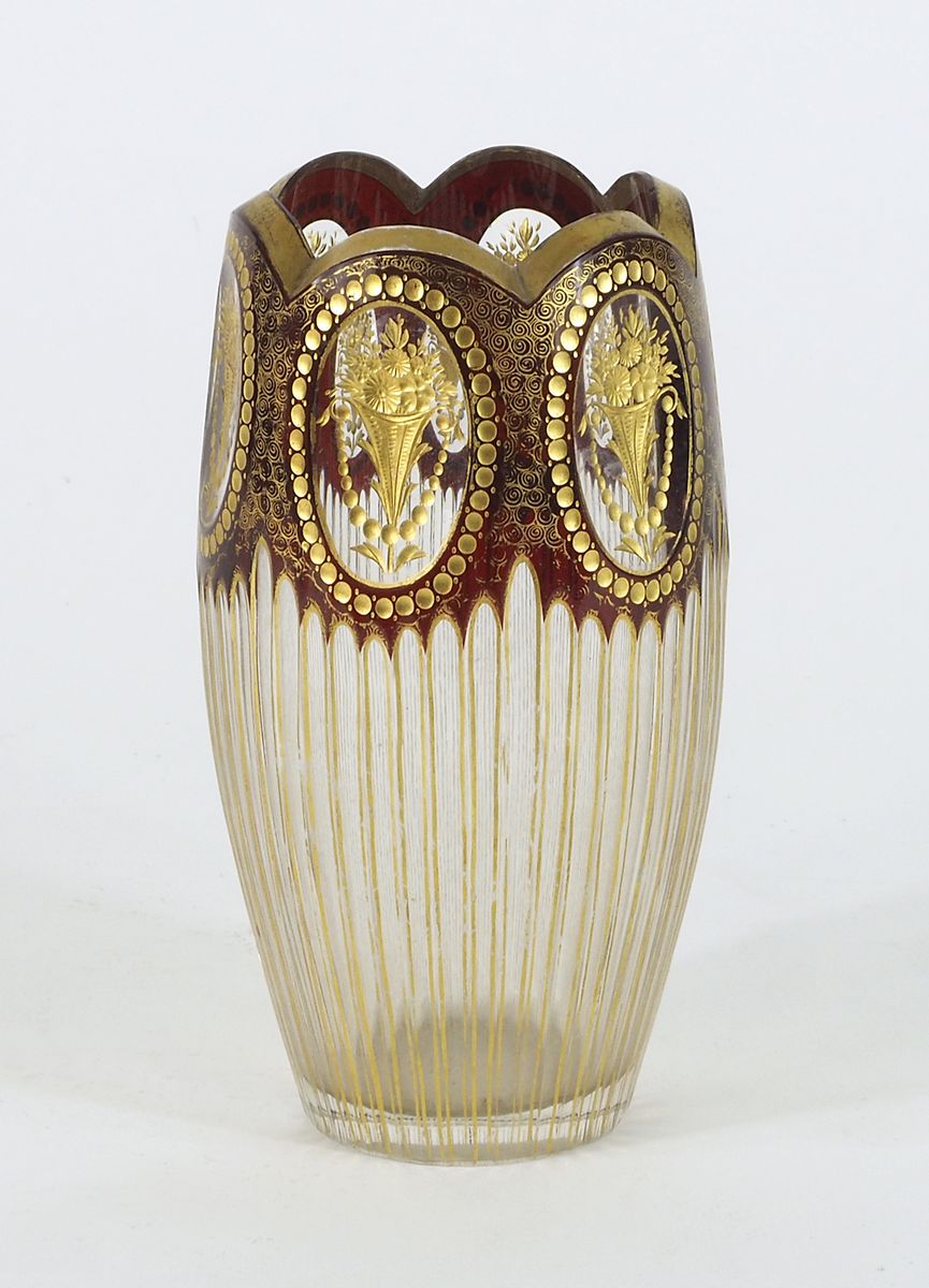 Vaso in vetro con decori policromi e dorati. H. cm. 18.