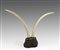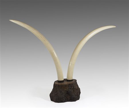 Coppia di zanne di elefante lucidate riempite con legno nella cavità, poggianti su base in legno a tronco d'albero. Kg tot zanne 24,50. H. tot cm. 140, larg tot cm. 188. Entrambe con certificato Cites Italia eseguito in data 2015.