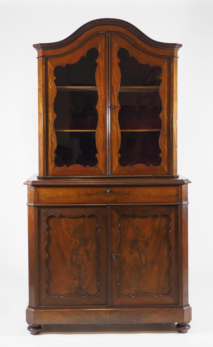 Credenza in legno a doppio corpo, parte inferiore a 2 ante e cassetto, parte superiore a 2 ante a vetri. cm. 195x102x45.