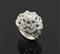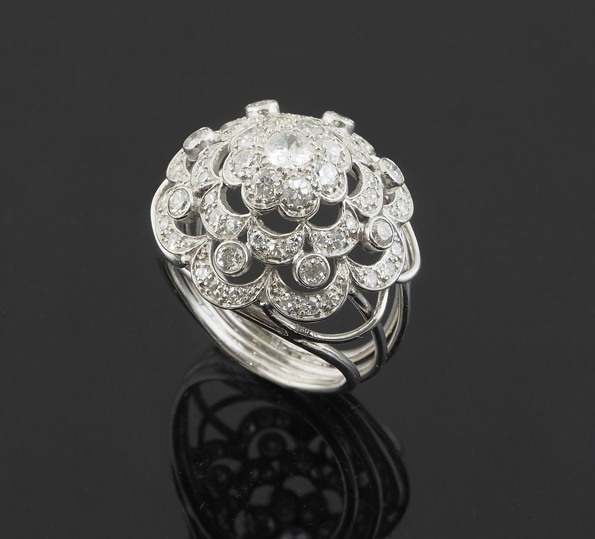 Anello in oro bianco a cupola traforata di forma floreale con diamanti taglio brillante. Misura 19