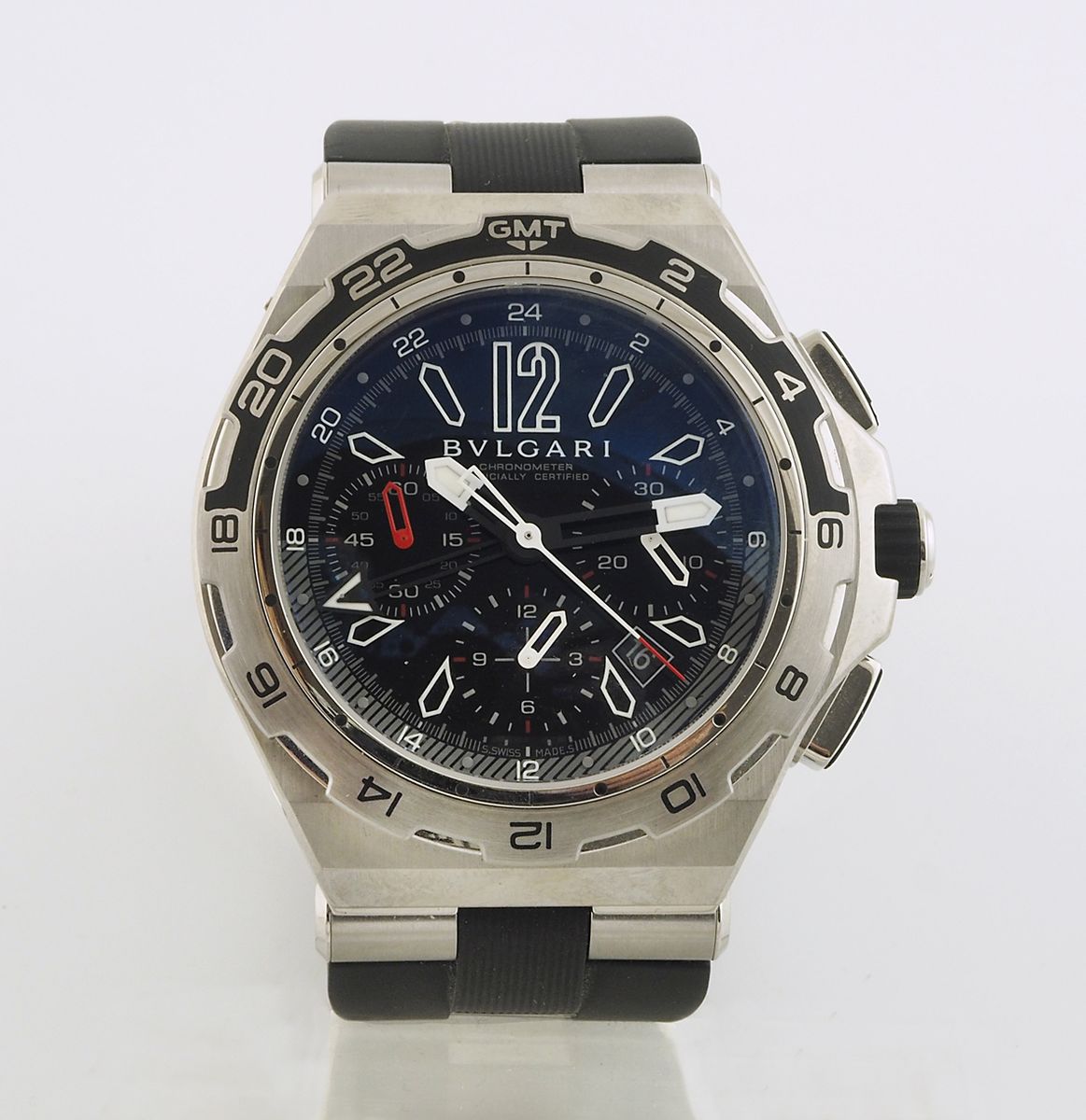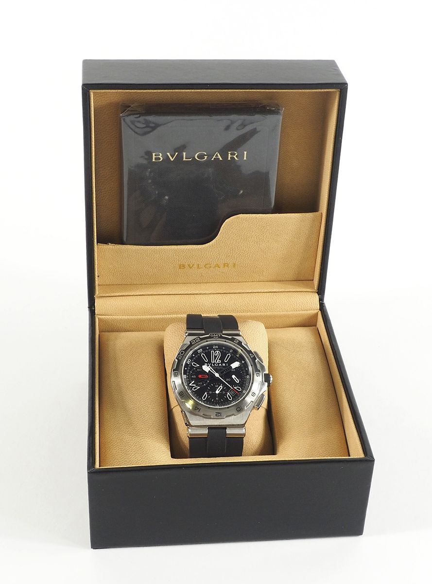 Bvlgari: cronografo da polso GMT da uomo con cassa rotonda in acciaio, cinturino in gomma. Con scatola e garanzia..Pari al nuovo.
