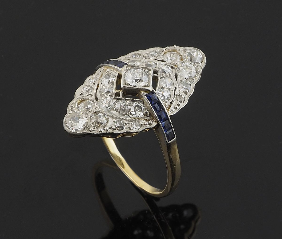 Anello liberty in oro giallo e bianco di forma ovale, ricoperto da diamanti taglio brillante , al centro fila di piccoli zaffiri. Misura 17
