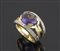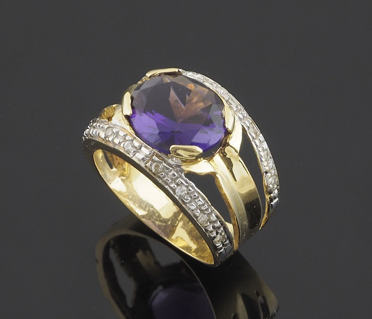 Anello in oro giallo a fascia con ametista ovale e due filedi diamantini....
