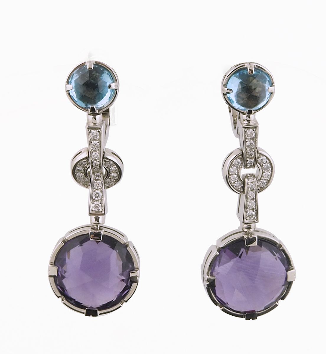 Orecchini pendenti Bulgari in oro bianco con acquamarina, diamantini e finale di ametista