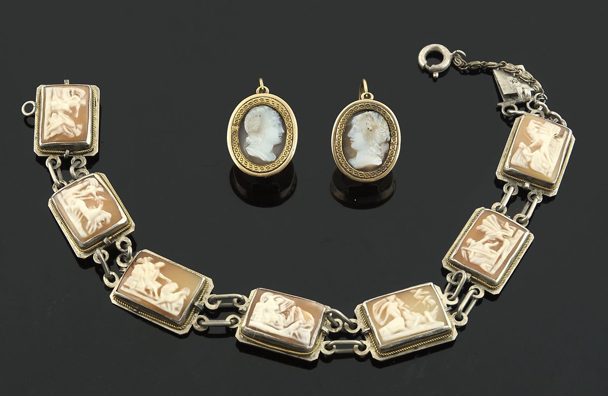 Parure composta da bracciale e paio di orecchini costruiti con tessere a cameo.
