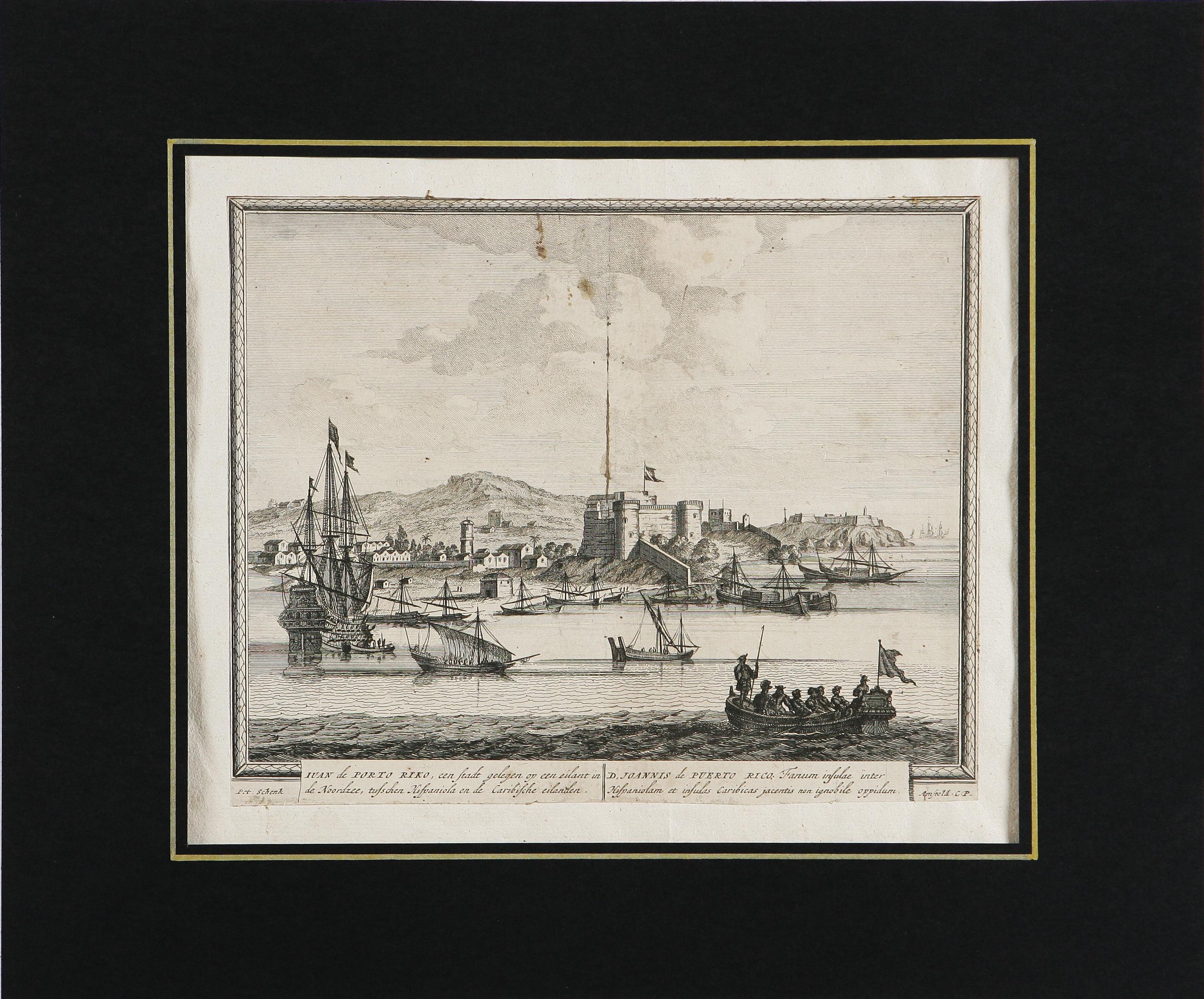 SCHENK PETER (1660 - 1718) Veduta del porto di Portorico con navi spagnole alla fonda. Acquaforte. Cm 26,3x21,4. Incisione calcografica all’acquaforte applicata a carta d’epoca- Amsterdam fine XVII° sec. - Dim. della stampa rifilata al margine L. 26,3 x H. 21,4 cm.Bibliogr. BENEZIT, IX, 362 (Edizione del 1976) - BRYAN'S, V, 36 - S. TICOZZI, III, 319 - HUBER ET ROST, VI, 249.