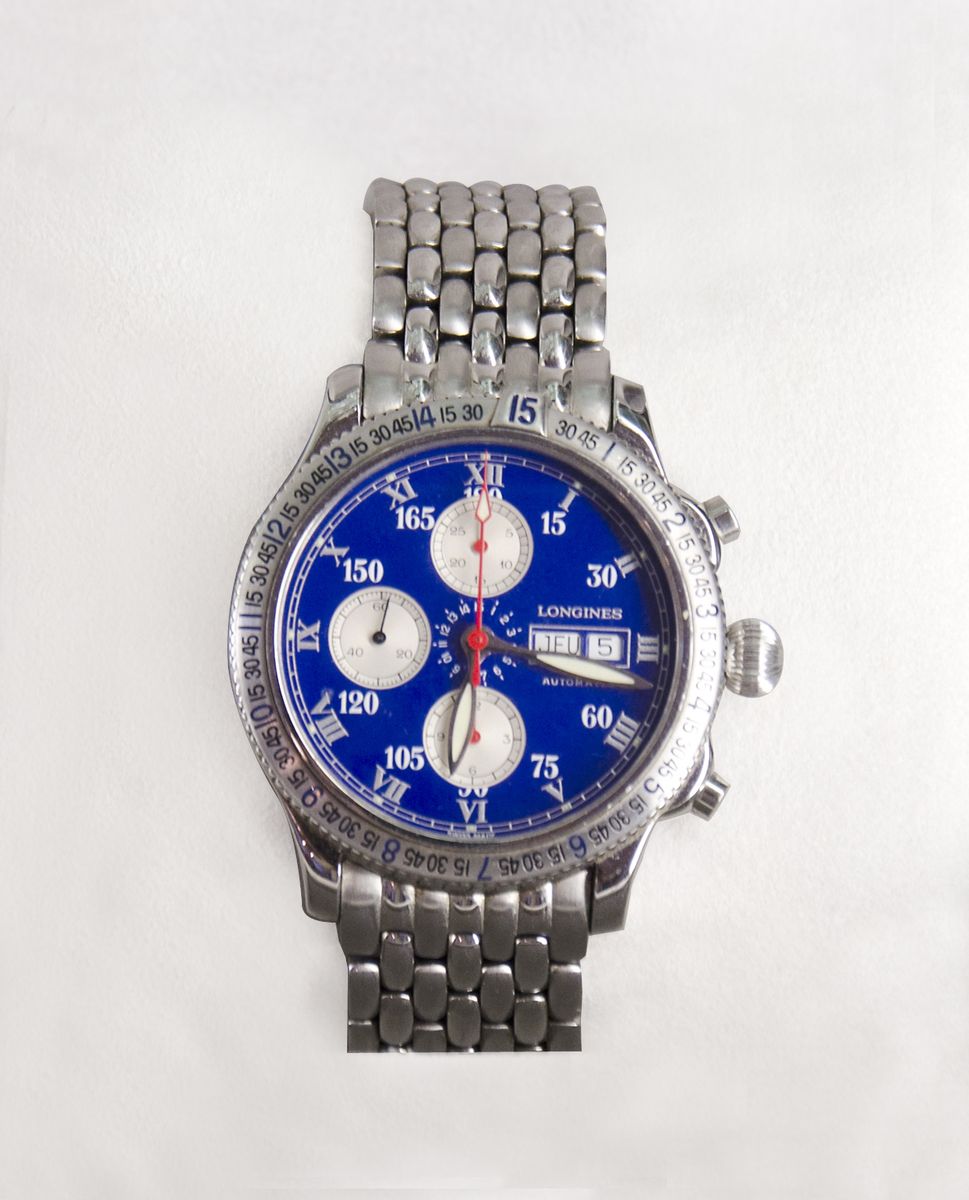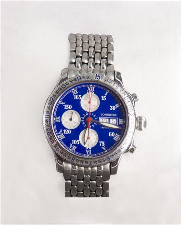 Longines: cronografo da polso in acciaio con quadrante blu, cinturino in acciaio. Con scatola.