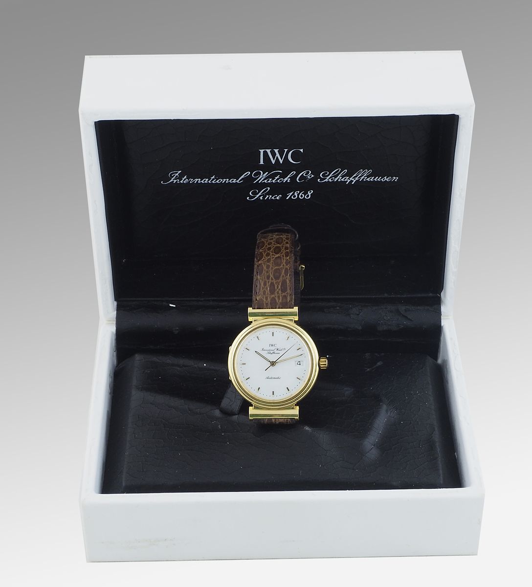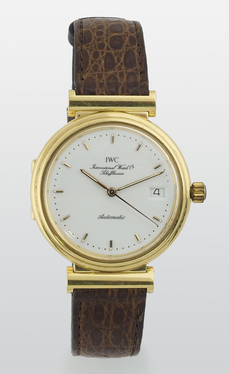 InternationalWatchC: orologio da polso modello Da Vinci con cassa rotonda in oro giallo con datario al 3, cinturino originale in pelle e fibbia in oro giallo. Con scatola originale.