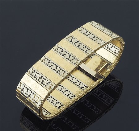 Largo bracciale in oro giallo e oro bianco lavorato a traforo e inciso....