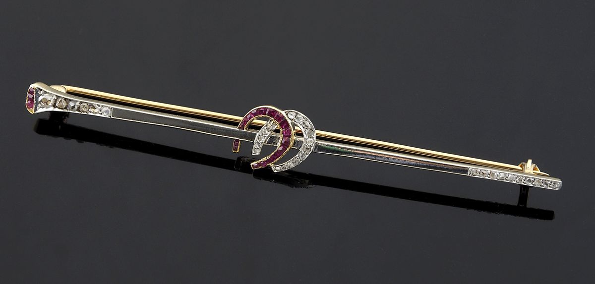 Spilla a barretta in oro giallo e bianco con al centro 2 piccoli ferri da cavallo , uno con diamantini e uno con rubini, lungh cm 9