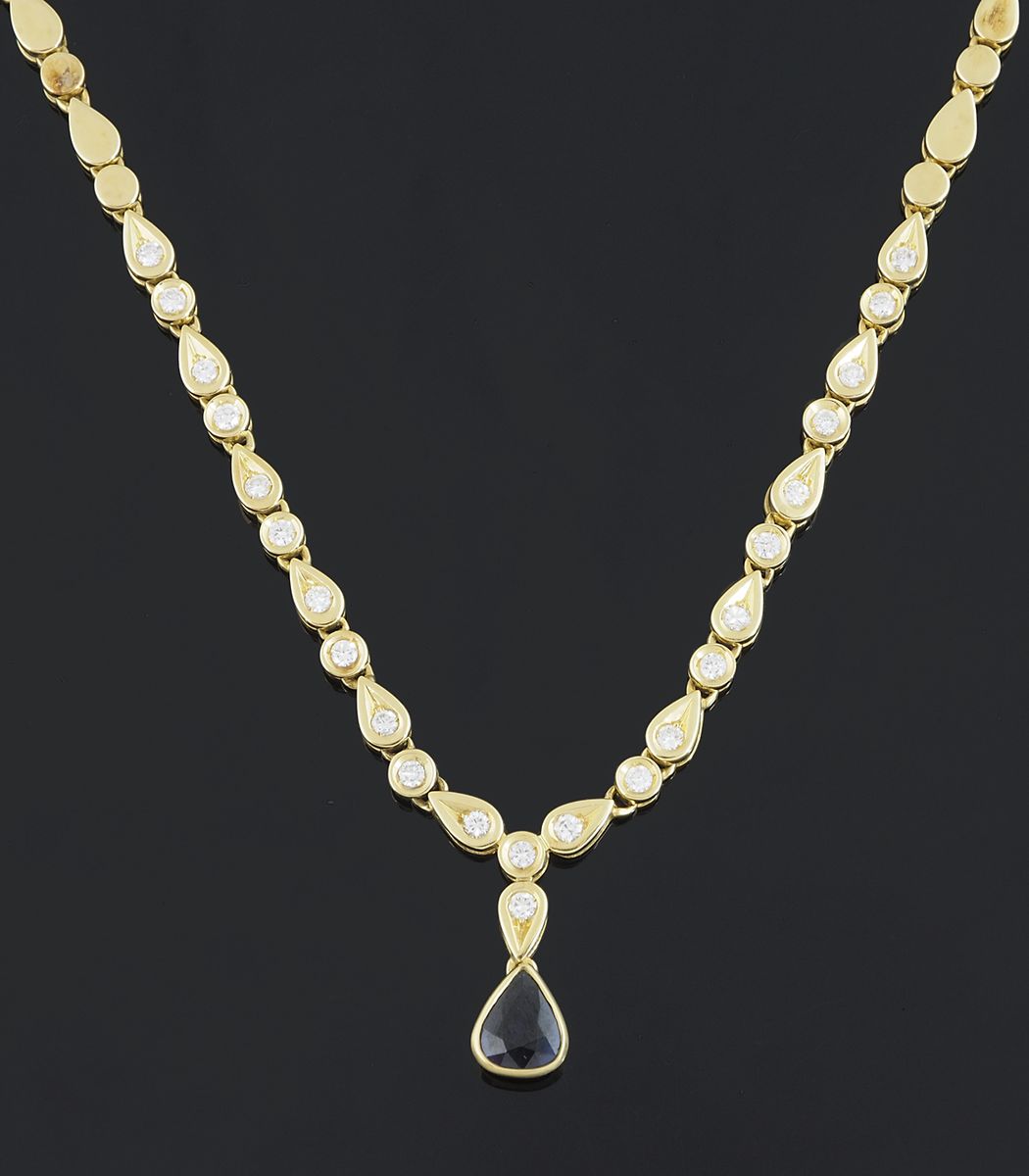 Girocollo in oro giallo con brillantini e zaffiro pendente. gr. tot 29,7.