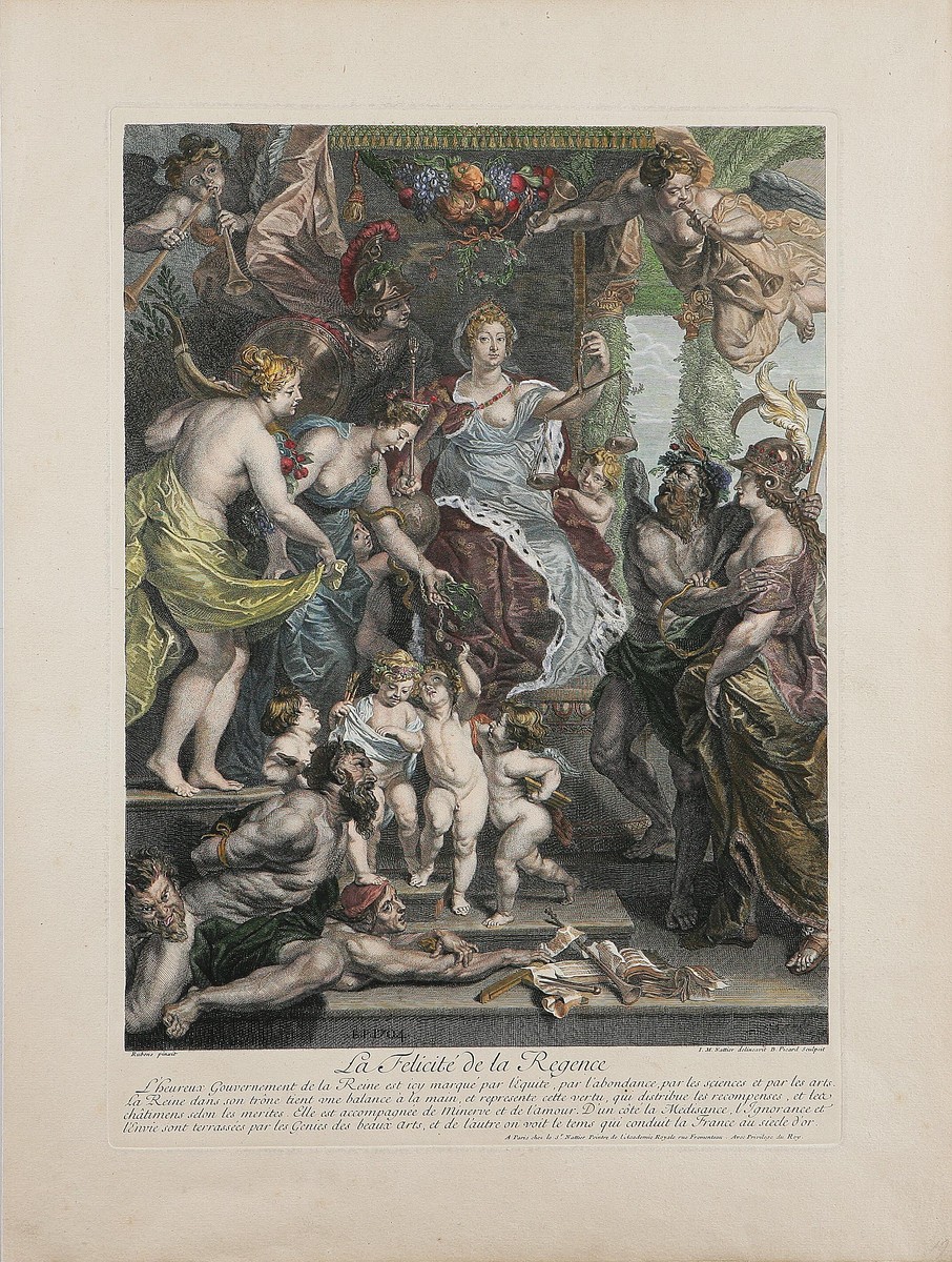 PICART BERNARD (1673 - 1733) La felicità della regina. 1709. Acquaforte e bulino. Cm 45,8x61. Incisione all’acquaforte e bulino con acquerellatura non coeva. tratta da un dipinto di Rubens su disegno di I.B. Nattier (appartenente alla raccolta dei dipinti di Rubens de “La Galerie du Luxemburg”) - Parigi 1709 - Dim. della stampa con ampi margini: L. 45,8 x 61 cm. (dim. della sola parte incisa senza le lettere L. 34 x 44,7 cm.).Bibliogr.: MILESI, 254 - GORI G., III, 44-48 - LE BLANC, III, 190-196 - ZANI, XV, 111 e varie - TICOZZI, III, 140-141.