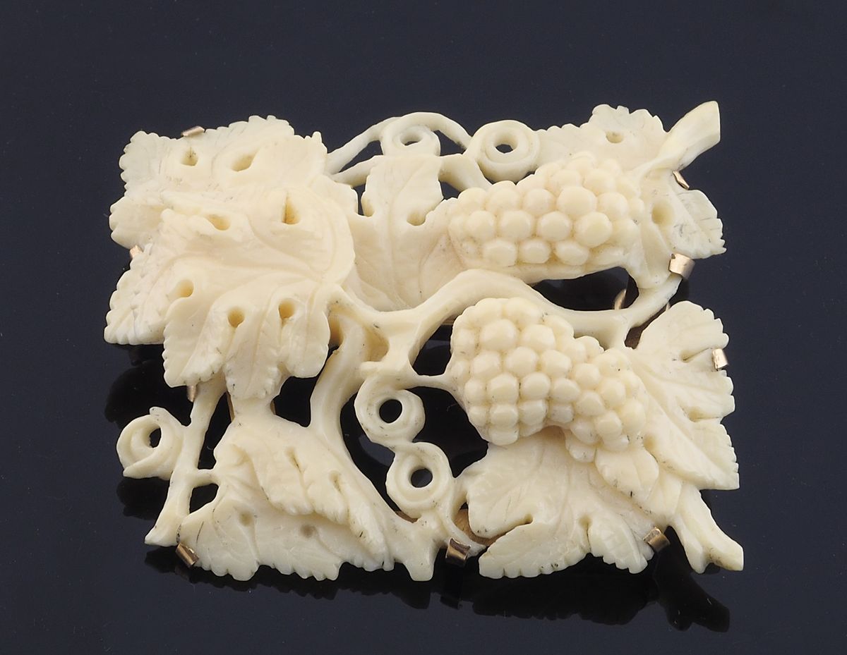 Spilla in avorio sbalzato a motivi di vite su montatura in oro giallo (lievi difetti). Primi '900.