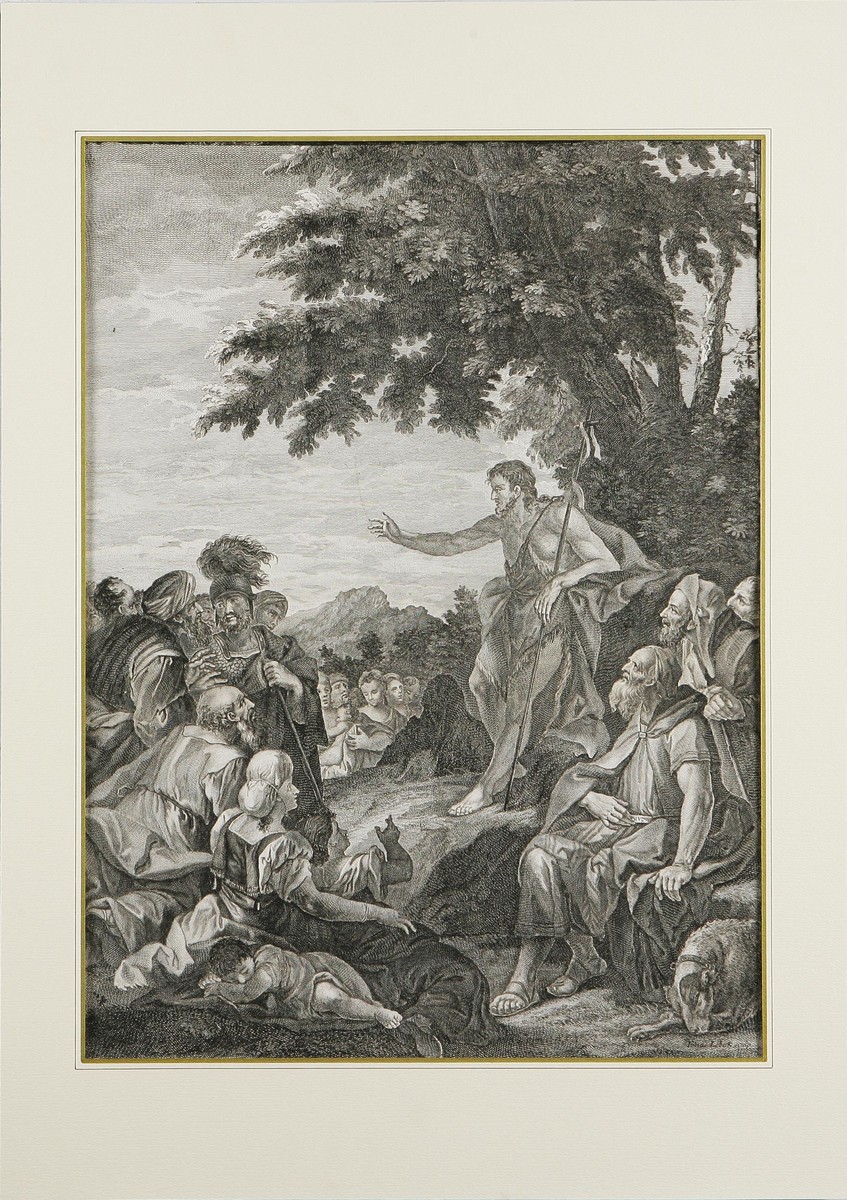 LOBECK TOBIAS Predicazione di San Giovanni. Acquaforte. Artista attivo in Germania nella metà del XVIII sec. Incisione calcografica all’acquaforte - Metà del XVIII° sec. - Dim. della stampa rifilata al margine senza le lettere L. 53,5 x 40,3 cm.Bibliogr.: LE BLANC, II, 558 - BENEZIT, VI, 707 (Ed. del 1976) - ZANI, XII, 46 - GORI G., II, 174.
